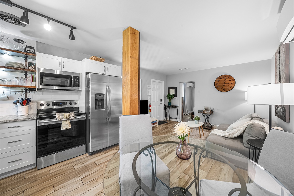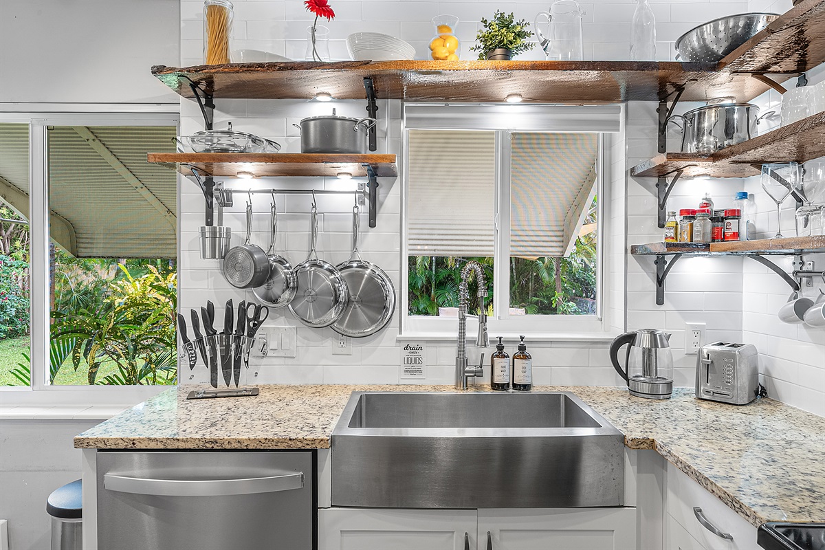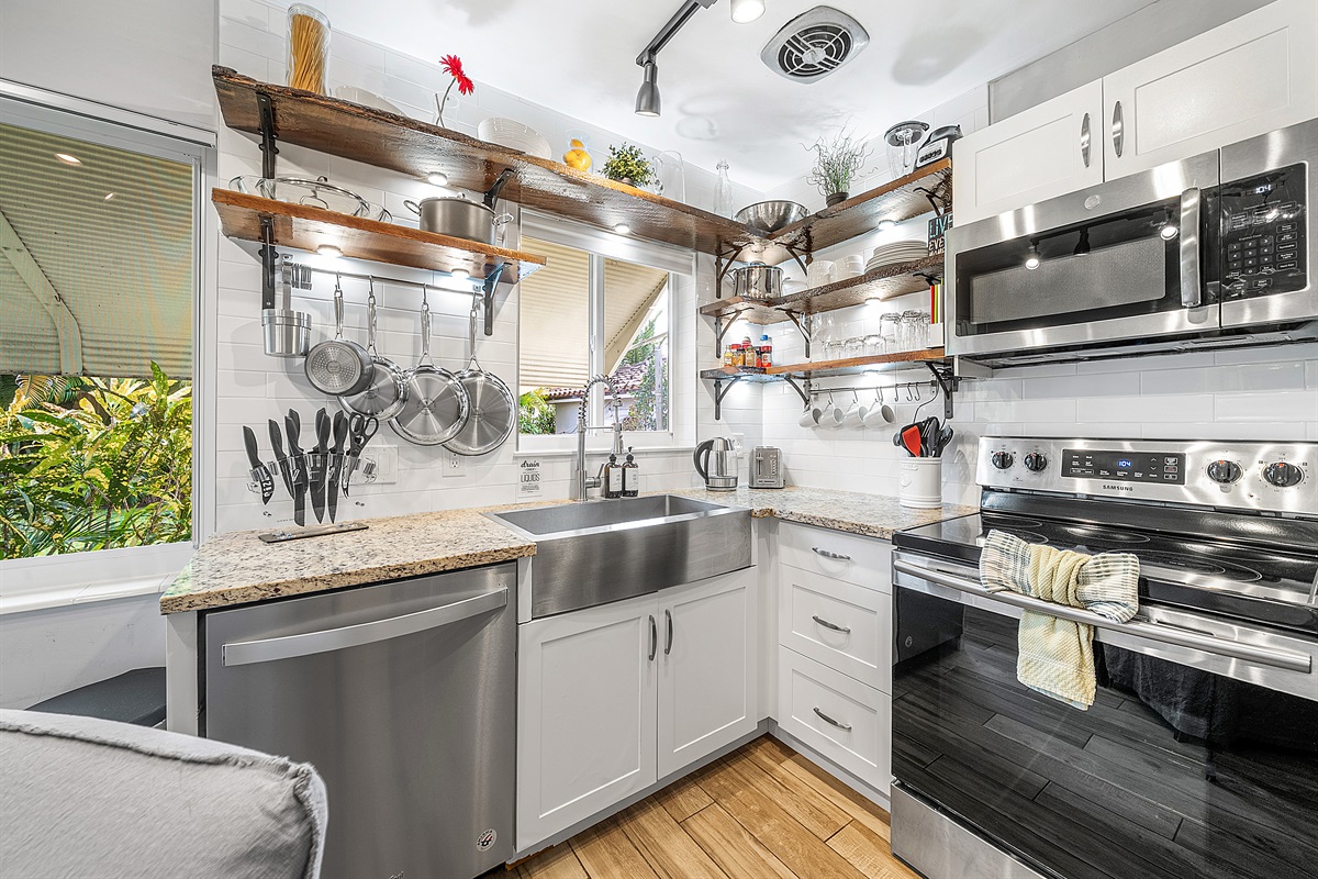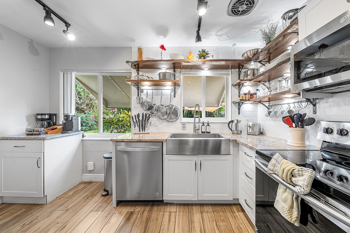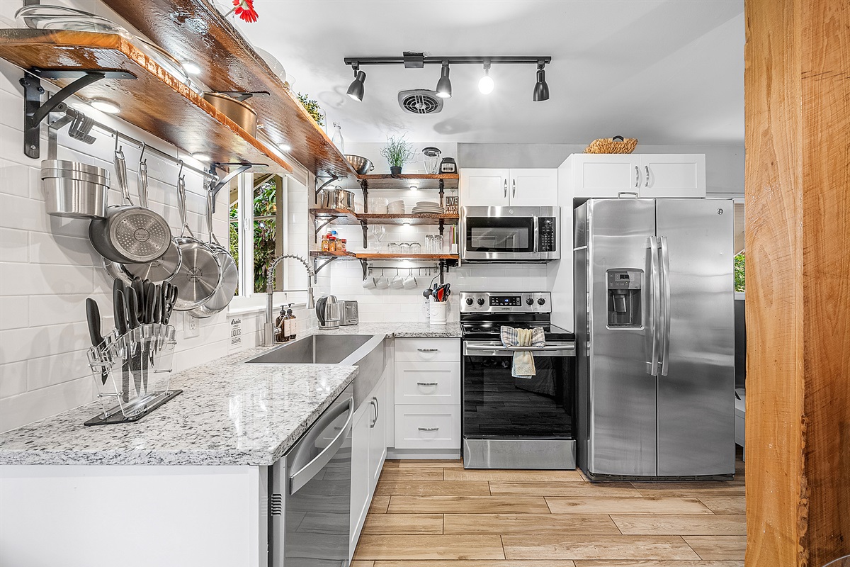Kitchen: The gourmet, farm-style kitchen is fully equipped with everything you need to cook and entertain. It features custom wood shelves, a large farm sink with a stylish faucet, and brand-new appliances, including a digital French door refrigerator with a water/ice dispenser, electric stove/oven, microwave, dishwasher, and a small toaster oven. For coffee lovers, enjoy the choice of a 12-cup drip coffee maker, Keurig, and milk frother. A full set of cookware, spices, baking dishes, and dinnerware ensures you’ll have everything you need for your culinary creations.