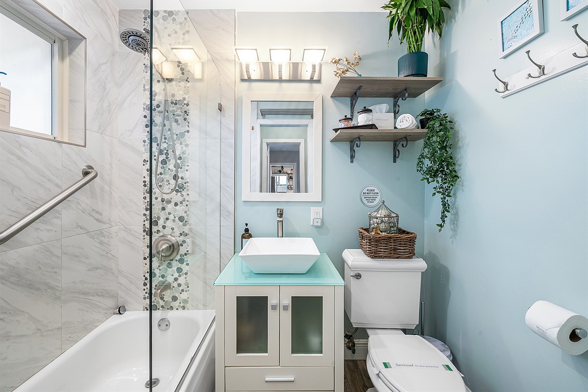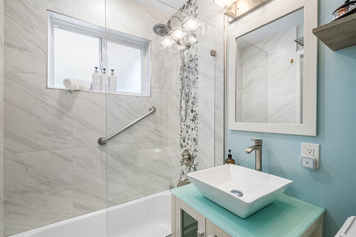 Bathroom: The spa-like bathroom is a sanctuary of relaxation, featuring a frameless glass shower, a vessel sink with decorative trim, and premium bathroom essentials, including shampoo, conditioner, body wash, makeup remover wipes, cotton balls, and hand soap. Plush bathrobes and disposable slippers are provided for an added touch of luxury.