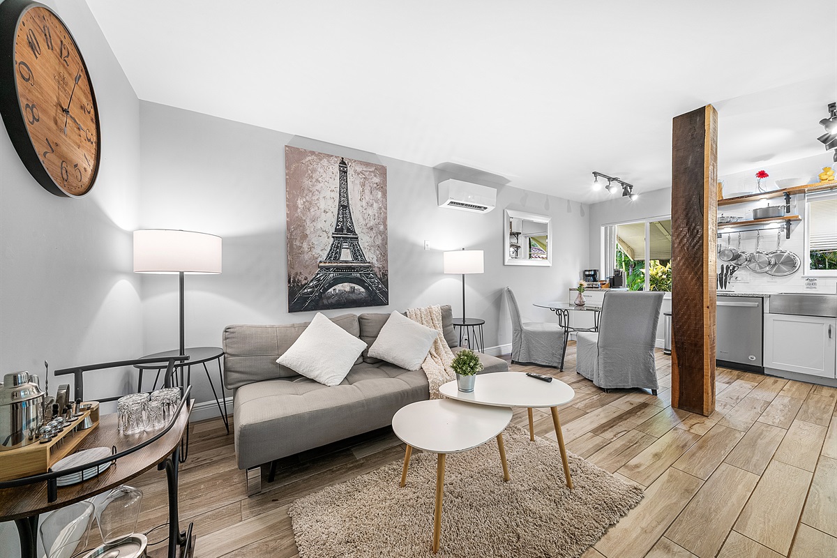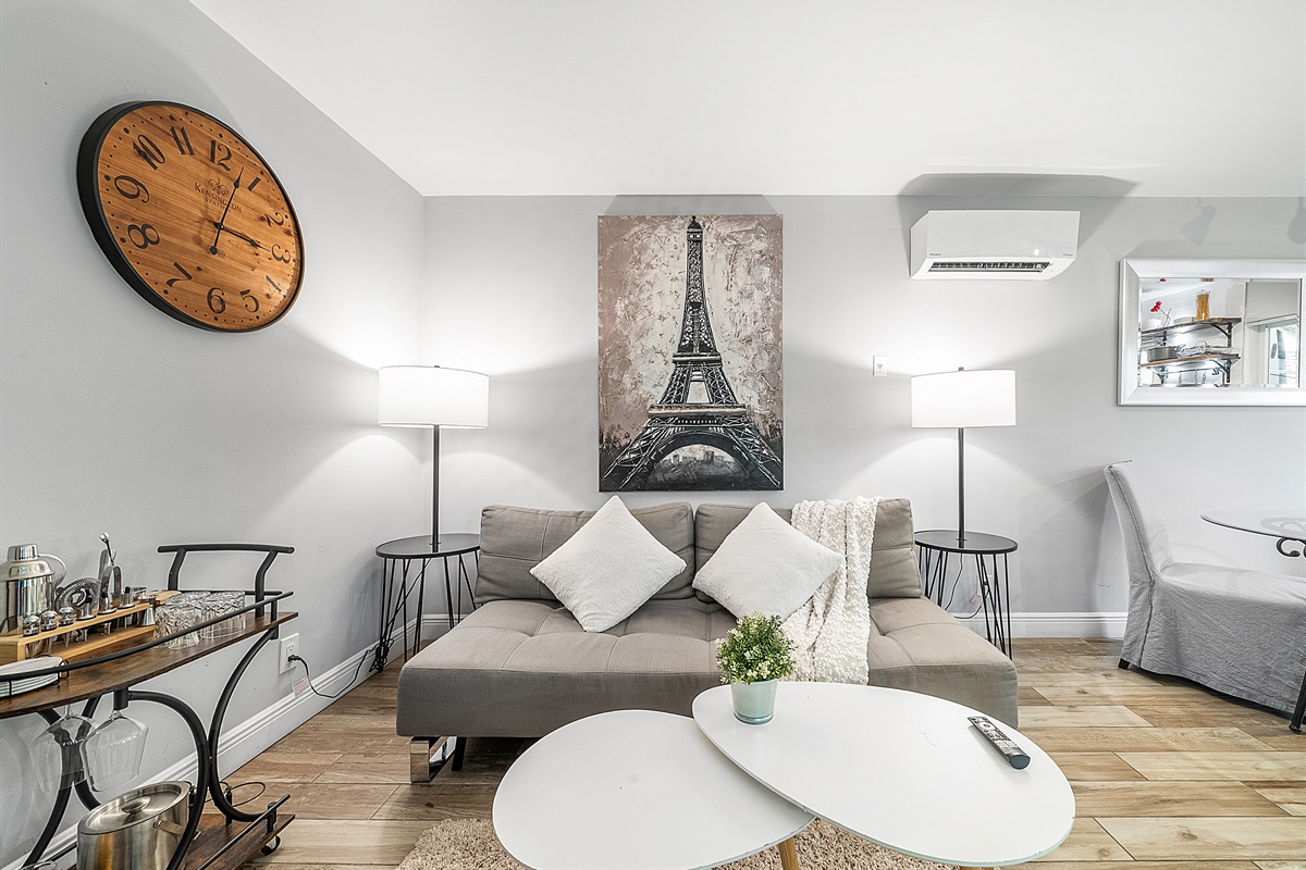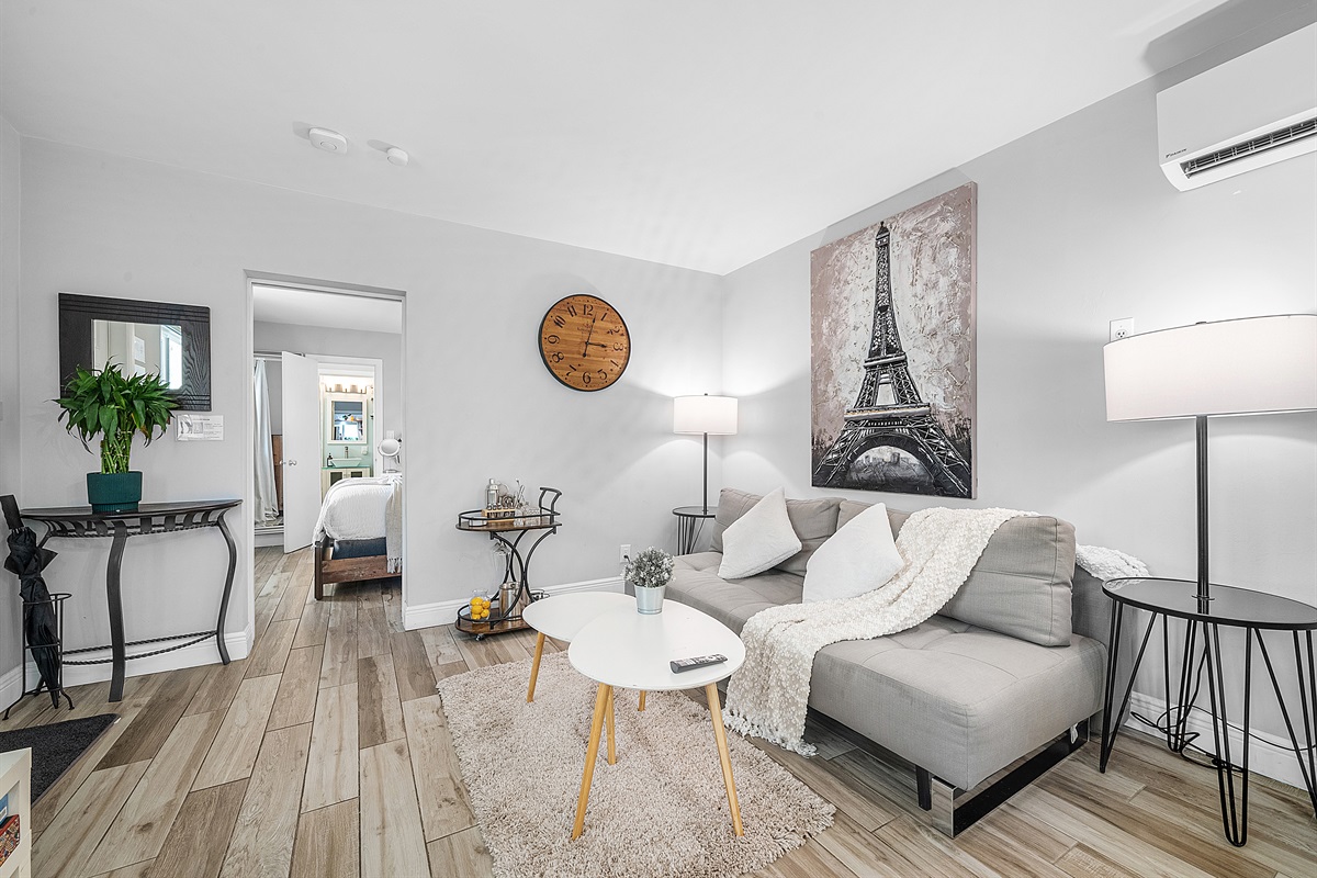 Living Room: Relax in the inviting living room, which features a modern sofa bed that opens to a queen size, a sleek coffee table, and a bar cart fully stocked with a mixology set, whiskey/shot glasses, and a wine cooler for crafting your favorite drinks. Entertainment is at your fingertips with a 55” Smart 4K TV offering free Prime Video and a variety of other streaming options.
