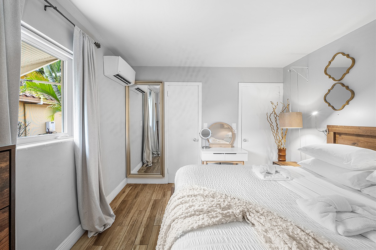 Bedroom: The cozy bedroom offers a comfortable queen bed with luxurious linens, hanging lamps for ambient lighting, a dresser with drawers, and three closets for ample storage. A makeup vanity with a lighted mirror provides the perfect spot to get ready for a night out or a day of exploring.