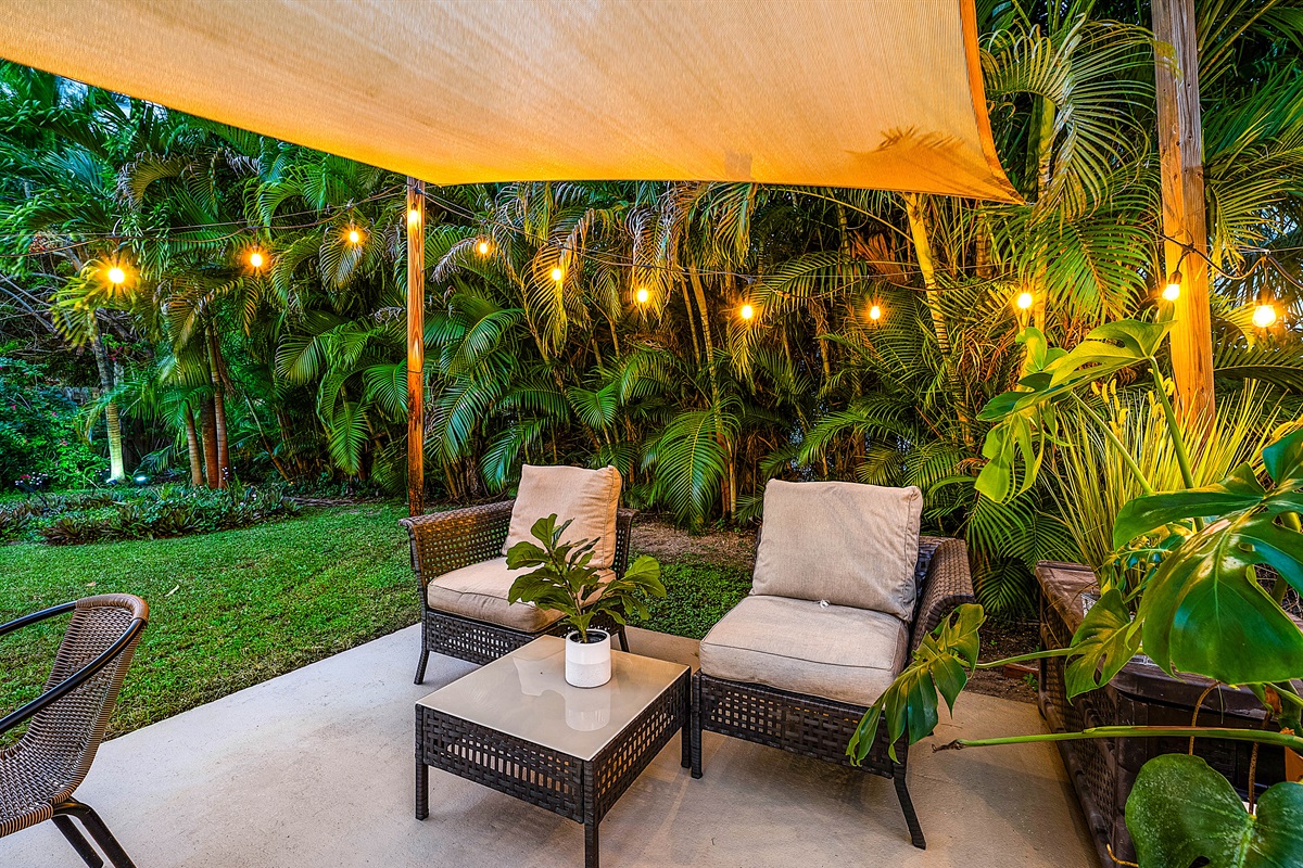 ✅ Lush Courtyard Patio: Relax in the open-air patio surrounded by a lush garden—perfect for unwinding day or night under charming bistro lights.