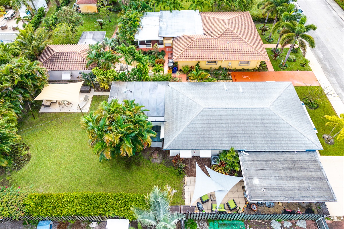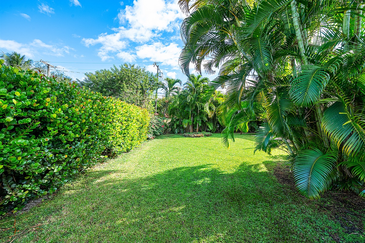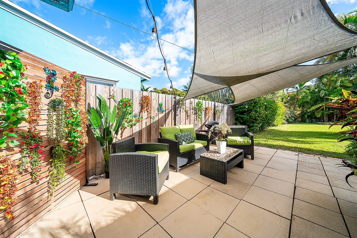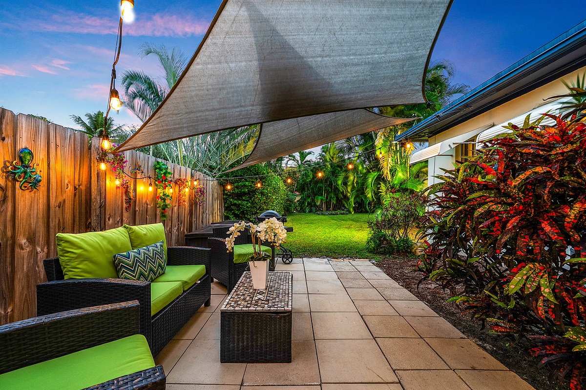 An extensive tropical landscaped backyard awaits on the patio. Send the kids out to the huge backyard with lots of room to run and play while you gather for drinks and conversation on the shaded courtyard, featuring seating for four.