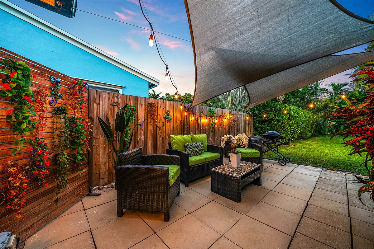 As evening falls, enjoy the ambiance of the twinkling patio bistro lights while dinner sizzles on the grill.