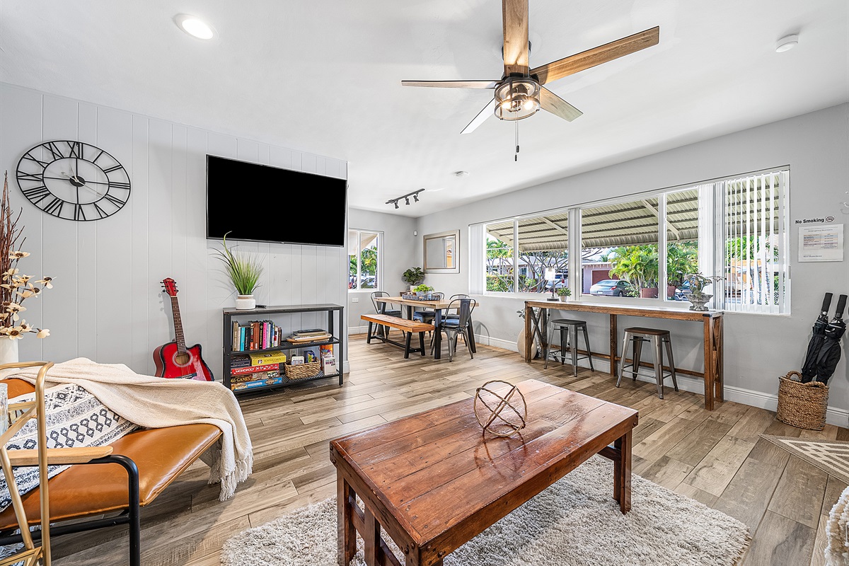 The spacious and open-concept living room serves as the entertainment hub of the home. Grab some popcorn, pick a movie out of thousands from complimentary Netflix & Amazon Prime Video selections and snuggle up on the plush sleeper sofa for a movie night on the brand new 55” Smart FireTV with voice commands feature.