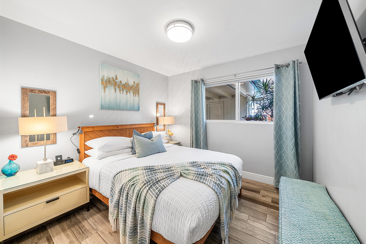 Snuggle up on a cloud-like Queen bed in the guest bedroom furnished with a 42” wall mounted flat-screen TV with Roku, closet, a comfy bench and portable fan with remote control. Complimentary set of disposable slippers!