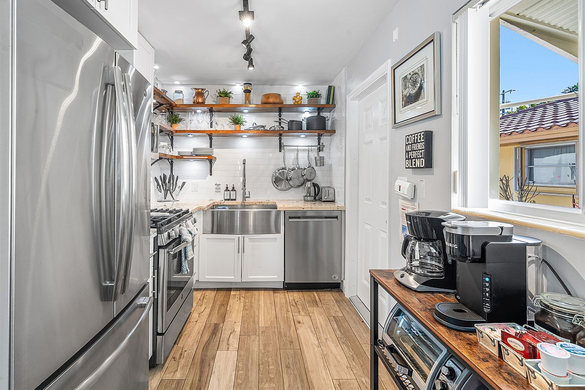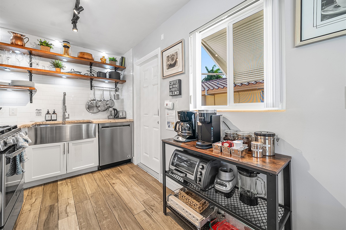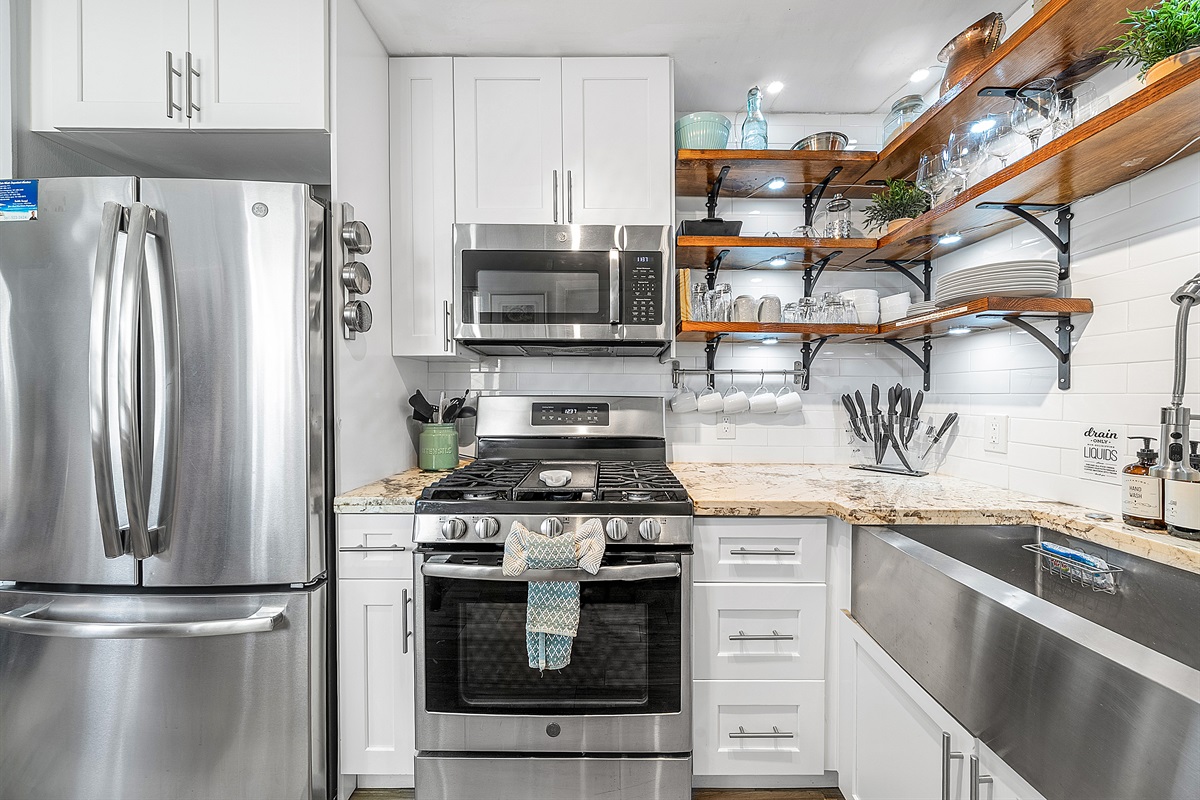 A state-of-the-art kitchen features handcrafted open-shelving stocked with every gadget and piece of cookware a chef could dream of. Whip up delicious meals with a full set of top-of the-line stainless steel appliances, plenty of spices and cooking essentials & a massive farmhouse sink.