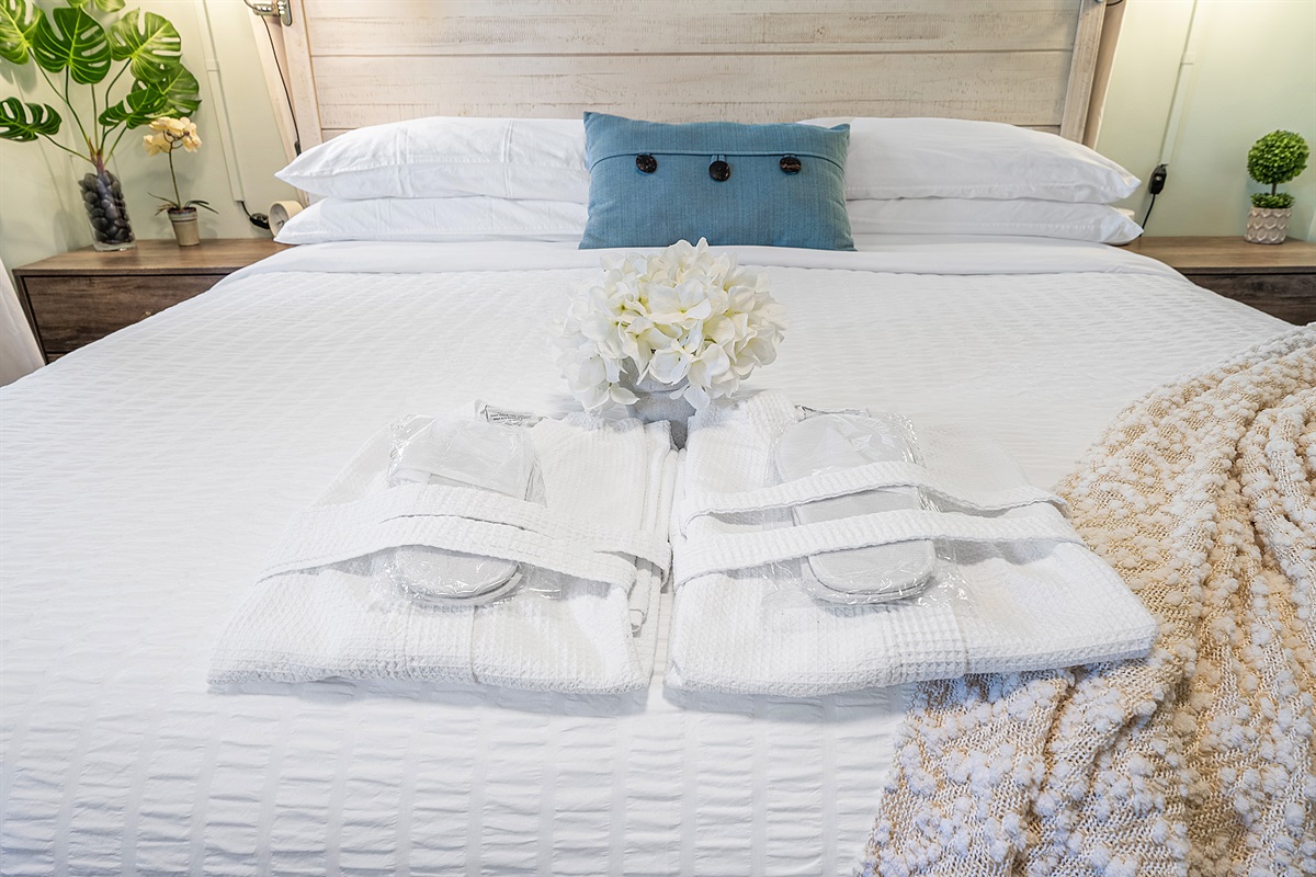 ✅ Luxury Touches – King bed, spa-style shower, plush robes, disposable slippers, hotel-quality linens, and complimentary snacks & beverages.