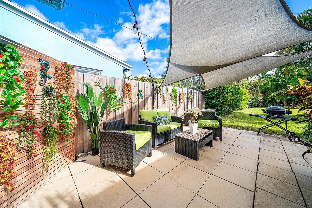 This property is a duplex consisting of two separate units with separate entrances and separate ACs. This unit faces the street and north side of the duplex. The only area shared with the other unit is the laundry room which is a separate, stand alone room located at the carport containing a state-of-the-art washer & dryer. The patio is not fenced to the street, nor divided between the two units, but each unit has its own separate and private outdoor seating and grilling area. Each seating/grilling area is not visible from each other.