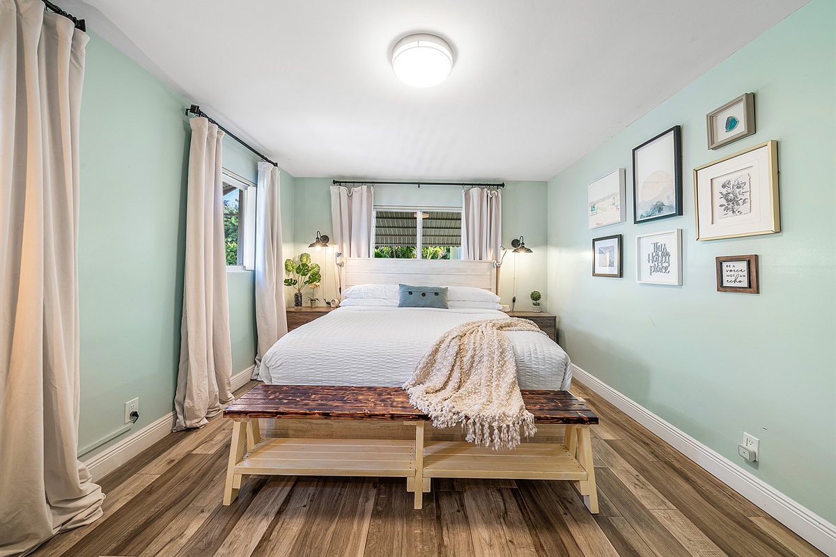 The Master Bedroom boasts a King bed, bench and a large desk.