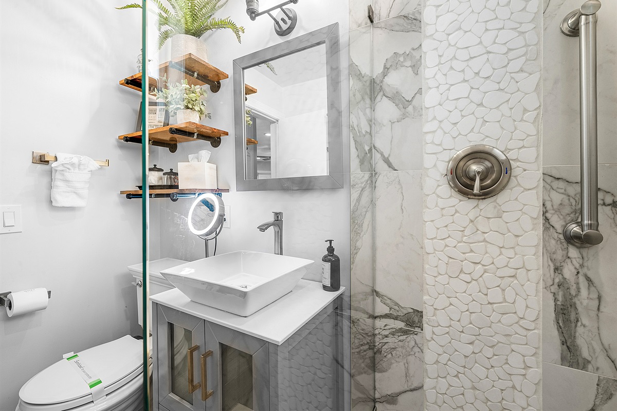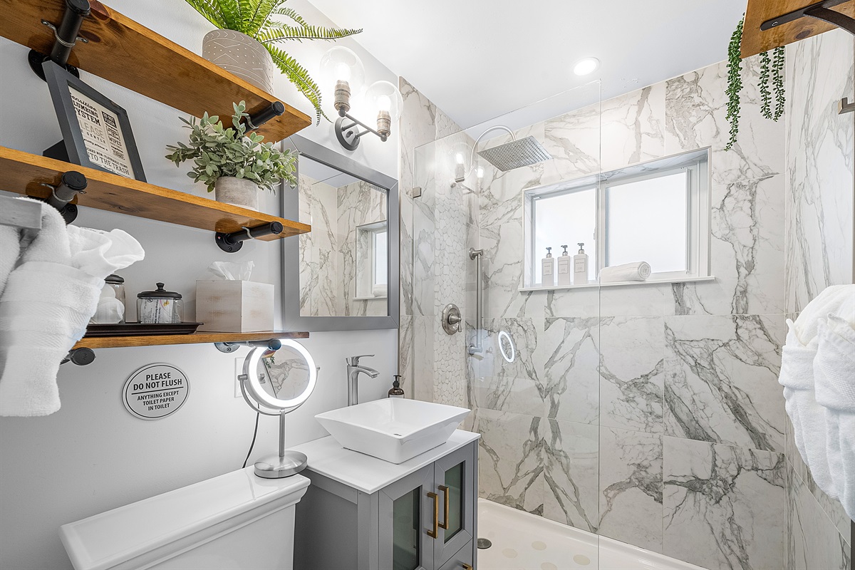 The spa-like bathroom wows with an extra-tall walk-in shower featuring Carrara Marble look tile, glass shower doors and a spa shower head. Freshen up in the trendy vessel sink and feel like in a five star resort with our a full set of toiletries & bathrobes.