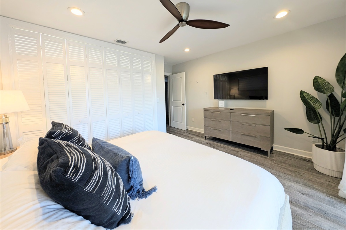 Find quiet privacy and your own direct access to the patio & pool on the inviting master bedroom, furnished with a stately king bed and a 50” Smart flat-screen TV. A massive walk-in closet connects to the en-suite bathroom featuring a dual vessel sink and glass-enclosed walk-in shower.